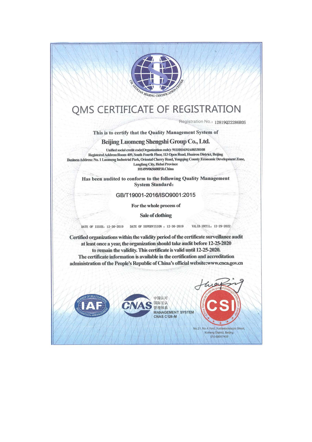 質量管理體系認證證書