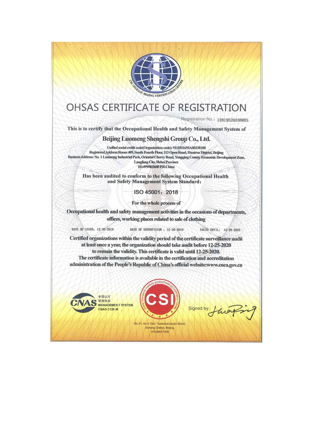 職業健康安全管理體系認證證書